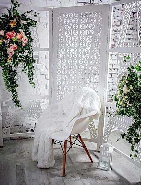 Напротив расположена {keyword} фотозона в стиле прованс с деревянной ширмой и кофейным столиком.